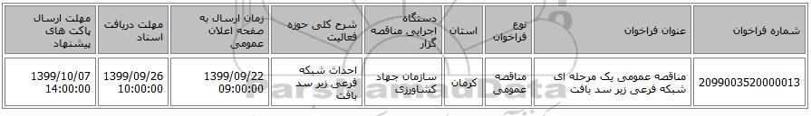 | 2099003520000013 | مناقصه عمومی یک مرحله ای شبکه فرعی زیر سد بافت | مناقصه عمومی | کرمان | سازمان جهاد کشاورزی | احداث شبکه فرعی زیر سد بافت | 1399/09/22 09:00:00 | 1399/09/26 10:00:00 | 1399/10/07 14:00:00 |