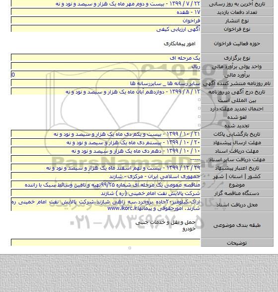 مناقصه عمومی یک مرحله ای شماره ۹۹/۲۵تهیه و تامین وسائط سبک با راننده