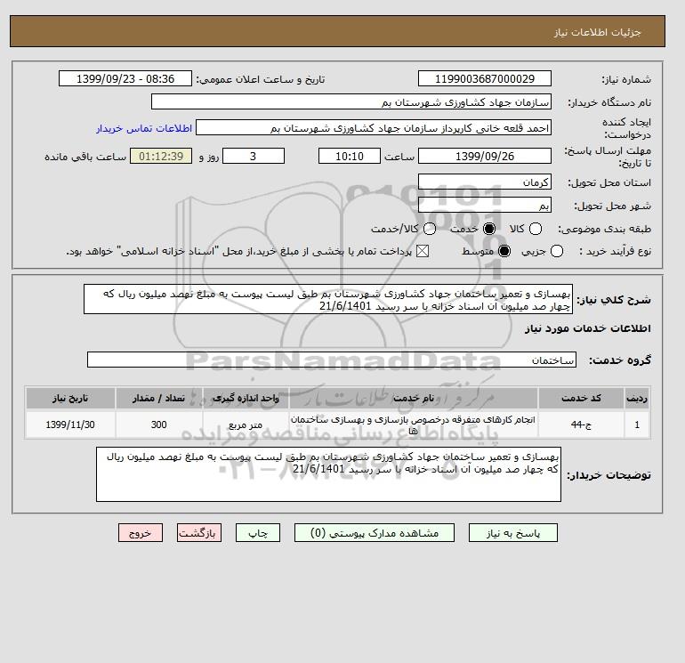 توضیحات خریدار:بهسازی و تعمیر ساختمان جهاد کشاورزی شهرستان بم طبق لیست پیوست به مبلغ نهصد میلیون ریال که چهار صد میلیون آن اسناد خزانه با سر رسید 21/6/1401