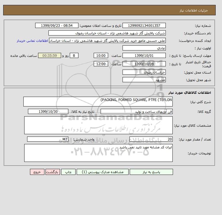 نام دستگاه خریدار:شرکت پالایش گاز شهید هاشمی نژاد - استان خراسان رضوی