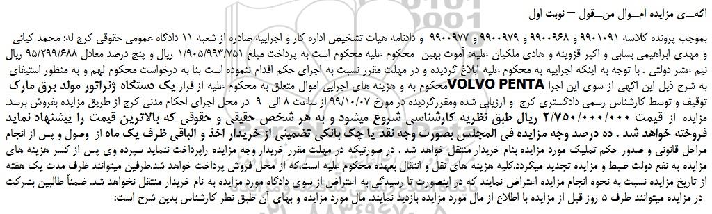 بموجب پرونده کلاسه 9901091 و 9900968 و 9900979 و 9900977 و دادنامه هیات تشخیص اداره کار و اجراییه صادره از شعبه 11 دادگاه عمومی حقوقی کرج له: محمد کیائی و مهدی ابراهیمی بسابی و اکبر قزوینه و هادی ملکیان علیه: آموت بهین محکوم علیه محکوم است به پرداخت مبلغ 1/905/993/751 ریال و پنج درصد معادل 95/299/688 ریال نیم عشر دولتی . با توجه به اینکه اجراییه به محکوم علیه ابلاغ گردیده و در مهلت مقرر نسبت به اجرای حکم اقدام ننموده است بنا به درخواست محکوم لهم و به منظور استیفای محکوم به و هزینه های اجرایی اموال متعلق به محکوم علیه از قرار یک دستگاه ژنراتور مولد برق مارک VOLVO PENTA به شرح ذیل این اگهی از سوی این اجرا توقیف و توسط کارشناس رسمی دادگستری کرج و ارزیابی شده ومقررگردیده در مورخ 99/10/07 از ساعت 8 الی 9 در محل اجرای احکام مدنی کرج از طریق مزایده بفروش برسد. مزایده از قیمت 2/750/000/000 ریال طبق نظریه کارشناسی شروع میشود و به هر شخص حقیقی و حقوقی که بالاترین قیمت را پیشنهاد نماید فروخته خواهد شد . ده درصد وجه مزایده فی المجلس بصورت وجه نقد یا چک بانکی تضمینی از خریدار اخذ و الباقی ظرف یک ماه از وصول و پس از انجام مراحل قانونی و صدور حکم تملیک مورد مزایده بنام خریدار منتقل خواهد شد . در صورتیکه در مهلت مقرر خریدار وجه مزایده راپرداخت ننماید سپرده وی پس از کسر هزینه های مزایده به نفع دولت ضبط و مزایده تجدید میگردد.کلیه هزینه های نقل و انتقال بعهده محکوم علیه است.که از محل فروش پرداخت خواهد شد.طرفین میتوانند ظرف مدت یک هفته از تاریخ مزایده نسبت به نحوه انجام مزایده اعتراض نمایند که در اینصورت تا رسیدگی به اعتراض از سوی دادگاه مورد مزایده به نام خریدار منتقل نخواهد شد. ضمناً طالبین بشرکت در مزایده میتوانند ظرف 5 روز قبل از مزایده با اطلاع از مال مورد مزایده بازدید نمایند. مال مورد مزایده و بهای آن طبق نظر کارشناس بدین شرح است: