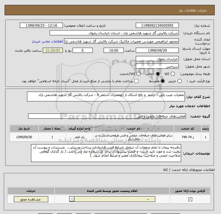 نام دستگاه خریدار:شرکت پالایش گاز شهید هاشمی نژاد - استان خراسان رضوی