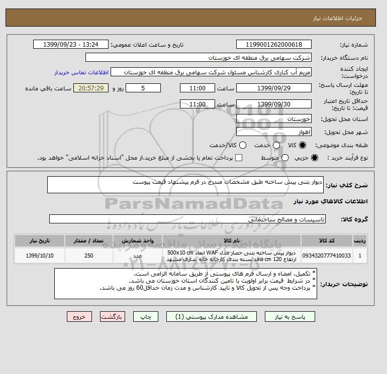شرح کلی نیاز: دیوار بتنی پیش ساخته طبق مشخصات مندرج در فرم پیشنهاد قیمت پیوست