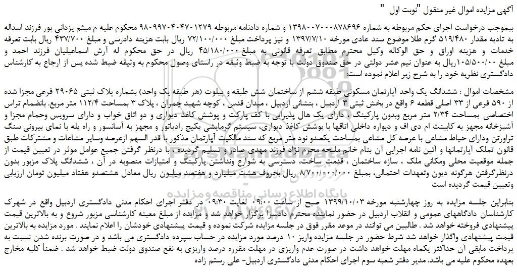 بنابراین جلسه مزایده به روز چهارشنبه مورخه 1399/10/03 صبح از ساعت 09:00 لغایت 09:30 در دفتر اجرای احکام مدنی دادگستری اردبیل واقع در شهرک کارشناسان دادگاههای عمومی و انقلاب اردبیل در حضور نماینده محترم دادسرا برگزار خواهد شد و مزایده از مبلغ معینه کارشناسی مزبور شروع و به بالاترین قیمت پیشنهادی فروخته خواهد شد . طالبین می توانند در موعد مقرر فوق در جلسه مزایده شرکت نموده و قیمت پیشنهادی خودشان را اعلام نمایند . مورد مزایده به بالاترین قیمت پیشنهادی واگذار خواهد شد شرط حضور در جلسه مزایده واریز 10 درصد مورد مزایده در حساب سپرده دادگستری می باشد و در صورت برنده شدن نسبت به پرداخت مابقی آن حداکثر یکماه مهلت خواهد داشت در صورت عدم واریزی در مهلت مقرره درصد واریزی به نفع صندوق دولت ضبط خواهد شد . ضمناً کلیه مخارج بعهده محکوم علیه می باشد. مدیر دفتر شعبه سوم اجرای احکام مدنی دادگستری اردبیل- علی رستم زاده