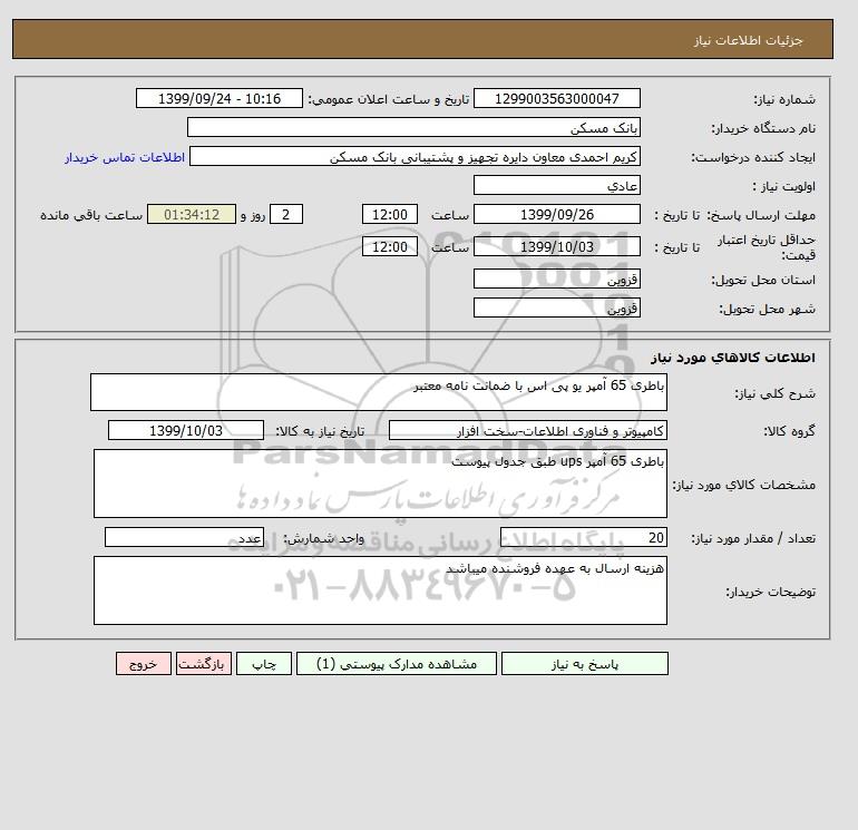 شرح کلی نیاز: باطری 65 آمپر یو پی اس با ضمانت نامه معتبر