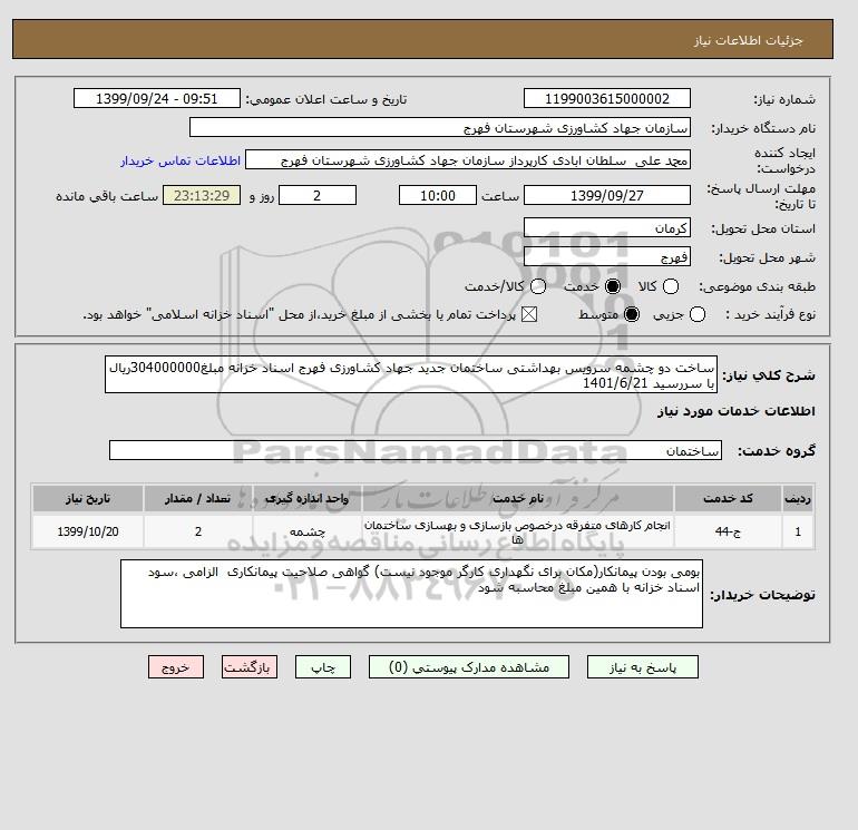 شرح کلی نیاز: ساخت دو چشمه سرویس بهداشتی ساختمان جدید جهاد کشاورزی فهرج اسناد خزانه مبلغ304000000ریال با سررسید 1401/6/21