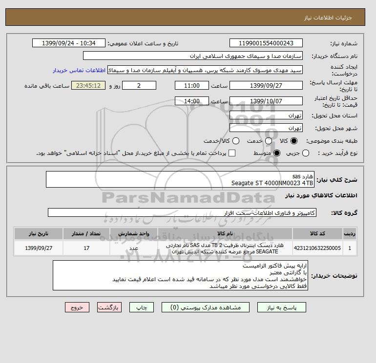 1 4231210632250005 هارد دیسک اینترنال ظرفیت 2 TB مدل SAS نام تجارتی SEAGATE مرجع عرضه کننده شبکه اندیش تهران عدد 17 1399/09/27