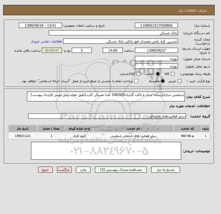 شرح کلی نیاز: شخصی سازی بسته بندی و پاکت گذاری100/000 عدد مسکن کارت(طبق مفاد پیش نویس قرارداد پیوست)