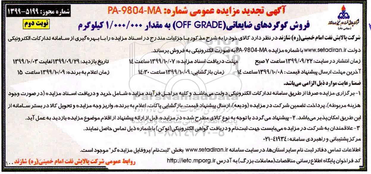 شرکت پالایش نفت امام خمینی (ره) شازند در نظر دارد کالای خود را به شرح مذکور با جزئیات مندرج در اسناد مزایده را با بهره گیری از سامانه تدارکات الکترونیکی دولت با شماره مزایده PA-9804-MA به صورت الکترونیکی به فروش برساند.