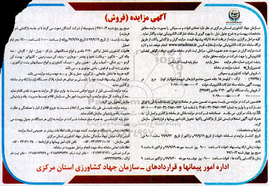 تاریخ انتشار مزایده در سامانه : ادوات از تاریخ 99.09.19 و تراکتور از تاریخ 99.9.23  ساعت 09.00 می باشد