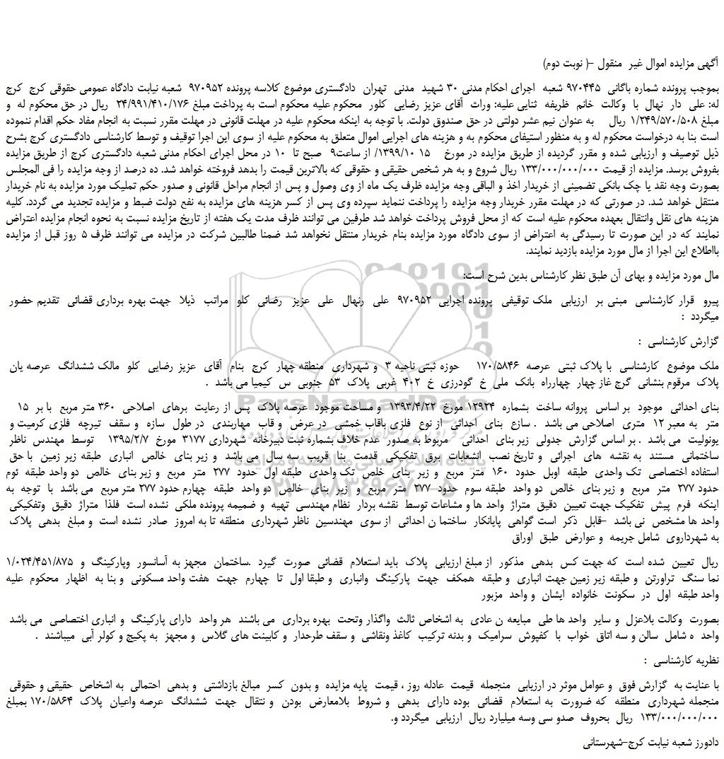 بموجب پرونده شماره باگانی 970445 شعبه اجرای احکام مدنی 30 شهید مدنی تهران دادگستری موضوع کلاسه پرونده 970952 شعبه نیابت دادگاه عمومی حقوقی کرج کرج له: علی دار نهال با وکالت خانم ظریفه ثنایی علیه: وراث آقای عزیز رضایی کلور محکوم علیه محکوم است به پرداخت مبلغ 24/991/410/176 ریال در حق محکوم له و مبلغ 1/249/570/508 ریال به عنوان نیم عشر دولتی در حق صندوق دولت. با توجه به اینکه محکوم علیه در مهلت قانونی در مهلت مقرر نسبت به انجام مفاد حکم اقدام ننموده است بنا به درخواست محکوم له و به منظور استیفای محکوم به و هزینه های اجرایی اموال متعلق به محکوم علیه از سوی این اجرا توقیف و توسط کارشناسی دادگستری کرج بشرح ذیل توصیف و ارزیابی شده و مقرر گردیده از طریق مزایده در مورخ 15 1399/10/ از ساعت9 صبح تا 10 در محل اجرای احکام مدنی شعبه دادگستری کرج از طریق مزایده بفروش برسد. مزایده از قیمت 133/000/000/000 ریال شروع و به هر شخص حقیقی و حقوقی که بالاترین قیمت را بدهد فروخته خواهد شد. ده درصد از وجه مزایده را فی المجلس بصورت وجه نقد یا چک بانکی تضمینی از خریدار اخذ و الباقی وجه مزایده ظرف یک ماه از وی وصول و پس از انجام مراحل قانونی و صدور حکم تملیک مورد مزایده به نام خریدار منتقل خواهد شد. در صورتی که در مهلت مقرر خریدار وجه مزایده را پرداخت ننماید سپرده وی پس از کسر هزینه های مزایده به نفع دولت ضبط و مزایده تجدید می گردد. کلیه هزینه های نقل وانتقال بعهده محکوم علیه است که از محل فروش پرداخت خواهد شد طرفین می توانند ظرف مدت یک هفته از تاریخ مزایده نسبت به نحوه انجام مزایده اعتراض نمایند که در این صورت تا رسیدگی به اعتراض از سوی دادگاه مورد مزایده بنام خریدار منتقل نخواهد شد ضمنا طالبین شرکت در مزایده می توانند ظرف 5 روز قبل از مزایده بااطلاع این اجرا از مال مورد مزایده بازدید نمایند.