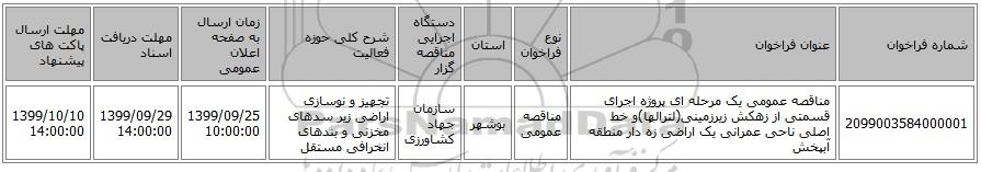 2099003584000001مناقصه عمومی یک مرحله ای پروژه اجرای قسمتی از زهکش زیرزمینی(لترالها)و خط اصلی ناحی عمرانی یک اراضی زه دار منطقه آبپخشمناقصه عمومیبوشهرسازمان جهاد کشاورزیتجهیز و نوسازی اراضی زیر سدهای مخزنی و بندهای انحرافی مستقل1399/09/25 10:00:001399/09/29 14:00:001399/10/10 14:00:00