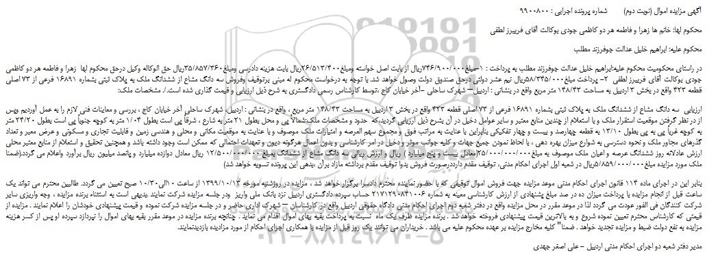 آگهی مزایده اموال (نوبت دوم) شماره پرونده اجرایی : 9900800