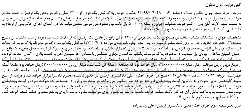 مشخصات اموال : ششدانگ یکباب ساختمان مسکونی پلاک یک فرعی از 2200 اصلی واقع در بخش یک اردبیل که از املاک ثبت شده بوده و سند مالکیت ان بشرح صفحه137 دفترجلد 58 بنام علی نارنجی ثبت صادر گردیده بموجب سند اجاره نامه عادی مورخه 1371/04/01سرقفلی یکباب مغازه که در محوطه پلاک موصوف احداث گردیده از سوی علی نارنجی به محمود نارنجی بمساحت حدود 30.80 متر مربع که دارای بالکن بمساحت حدود 8 متر مربع بوده واگذار گردیده محل وقوع ملک واقع در اردبیل خیابان ساحلی روبروی پل سیداباد در محدوده پلاک موصوف یکباب ساختمان تجاری مسکونی با مصالح آجر سیمان آهن با قدمت بالای 40سال احداث گردیده دارای امتیازات آب- برق- گاز و... بوده که با در نظر گرفتن موقعیت مکانی و سایر جوانب موثر در کارشناسی ششدانگ پلاک موصوف 65/000/000/000 ریال ارزیابی که از مبلغ مزبور ارزش سرقفلی مغازه مبلغ 12/000/000/000 ریال خواهد بود که چنانچه از مبلغ کل کسر شود مبلغ ارزیابی 53/000/000/000ریال خواهد بود مضافا اینکه حد شرقی پلاک موصوف در وضع موجود خیابان میباشد ولی طبق مفاد سند مالکیت قطعه سوم درب ورود در این حد است قید شده است بنابراین جلسه مزایده به روز چهارشنبه مورخه 99/10/24ساعت 09:00الی09:30صبح در اجرای احکام مدنی دادگستری اردبیل در حضور نماینده محترم دادسرا برگزار خواهد شد و مزایده از مبلغ معینه کارشناسی مزبور شروع و به بالاترین قیمت پیشنهادی فروخته خواهد شد . طالبین می توانند در موعد مقرر فوق در جلسه مزایده شرکت نموده و قیمت پیشنهادی خودشان را اعلام نمایند . مورد مزایده به بالاترین قیمت پیشنهادی واگذار خواهد شد شرط حضور در جلسه مزایده واریز 10 درصد مورد مزایده می باشد و در صورت برنده شدن نسبت به پرداخت مابقی آن حداکثر یکماه مهلت خواهد داشت در صورت عدم واریزی در مهلت مقرره درصد واریزی به نفع صندوق دولت ضبط خواهد شد . ضمناً کلیه مخارج بعهده محکوم علیه می باشد.