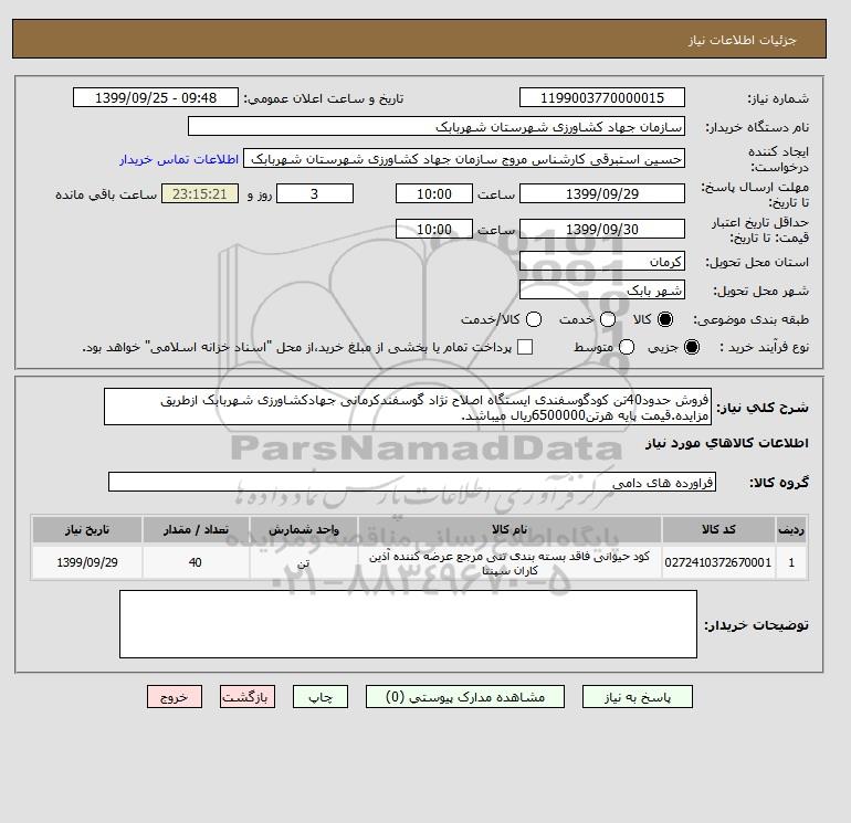 شرح کلی نیاز: فروش حدود40تن کودگوسفندی ایستگاه اصلاح نژاد گوسفندکرمانی جهادکشاورزی شهربابک ازطریق مزایده.قیمت پایه هرتن6500000ریال میباشد.