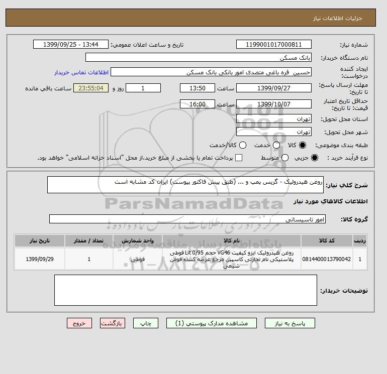 استعلام روغن هیدرولیک - گریس پمپ و ... (طبق پیش فاکتور پیوست) ایران کد مشابه است, استعلام روغن هیدرولیک - گریس پمپ و ... (طبق پیش فاکتور پیوست) ایران کد مشابه است