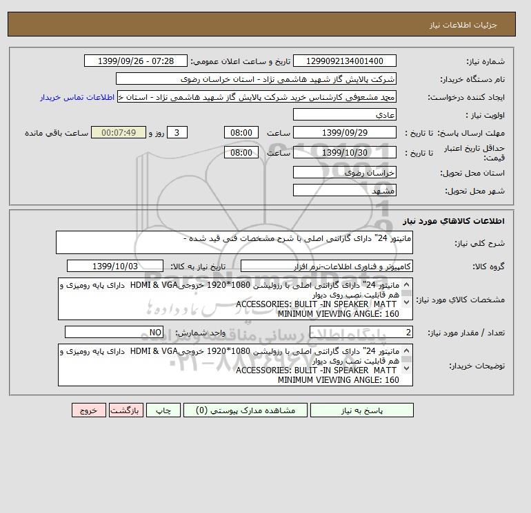 شرح کلی نیاز: مانیتور 24" دارای گارانتی اصلی با شرح مشخصات فنی قید شده -