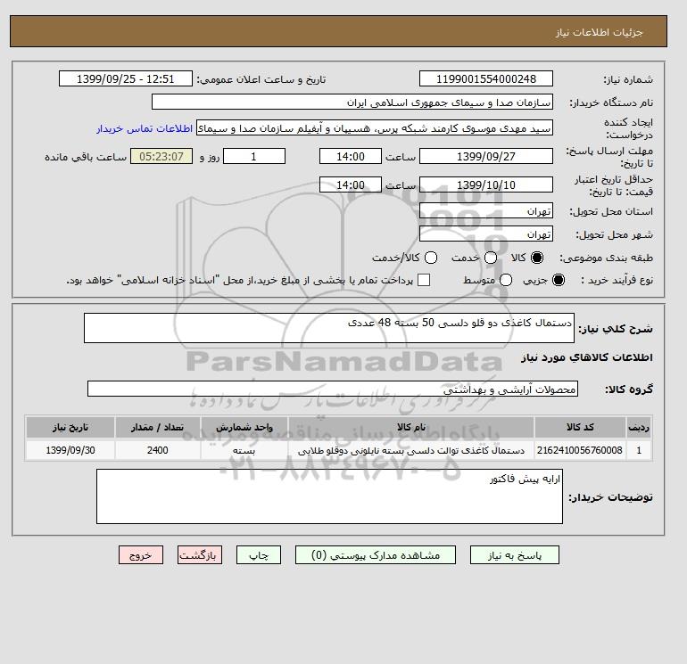 شرح کلی نیاز: دستمال کاغذی دو قلو دلسی 50 بسته 48 عددی
