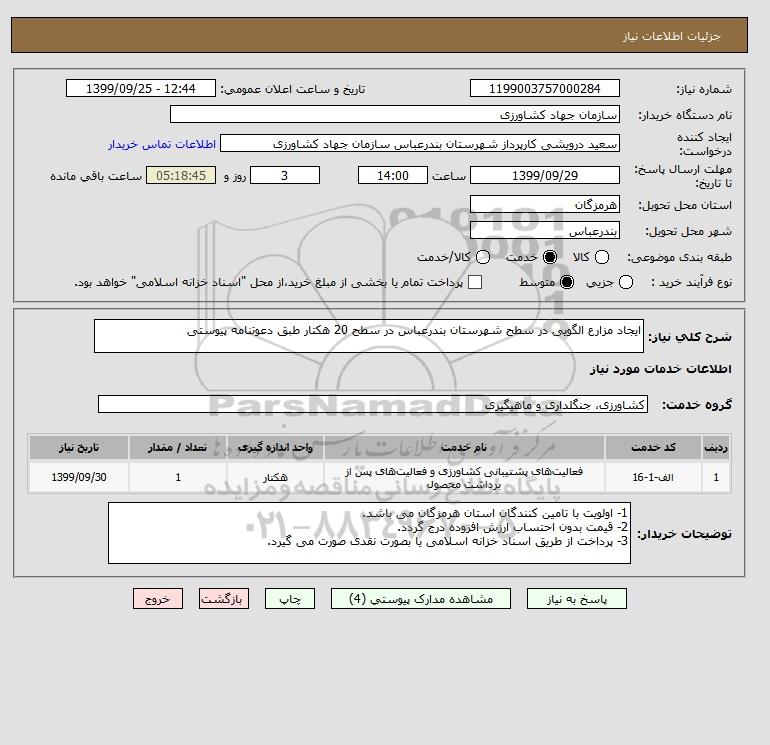 شرح کلی نیاز: ایجاد مزارع الگویی در سطح شهرستان بندرعباس در سطح 20 هکتار طبق دعوتنامه پیوستی