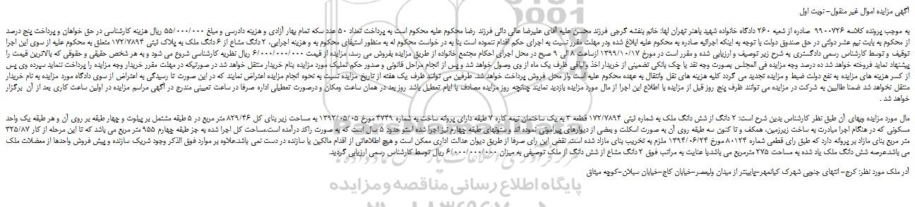 به موجب پرونده کلاسه 9900726 صادره از شعبه 260 دادگاه خانواده شهید باهنر تهران لها: خانم بنفشه گرجی فرزند محسن علیه آقای علیرضا عالی دائی فرزند رضا محکوم علیه محکوم است به پرداخت تعداد 50 عدد سکه تمام بهار آزادی و هزینه دادرسی و مبلغ 55/000/000 ریال هزینه کارشناسی در حق خواهان و پرداخت پنج درصد از محکوم به بابت نیم عشر دولتی در حق صندوق دولت با توجه به اینکه اجرائیه صادره به محکوم علیه ابلاغ شده ودر مهلت مقرر نسبت به اجرای حکم اقدام ننموده است بنا به در خواست محکوم له به منظور استیفای محکوم به و هزینه اجرایی، 2 دانگ مشاع از 6 دانگ ملک به پلاک ثبتی 172/7894 متعلق به محکوم علیه از سوی این اجرا توقیف و توسط کارشناس رسمی دادگستری به شرح زیر توصیف و ارزیابی شده و مقرر است در مورخ 1399/10/17 ازساعت 8 الی 9 صبح در محل اجرای احکام مجتمع خانواده از طریق مزایده بفروش می رسد، مزایده از قیمت 6/000/000/000 ریال نظریه کارشناسی شروع می شود و به هر شخص حقیقی و حقوقی که بالاترین قیمت را پیشنهاد نماید فروخته خواهد شد ده درصد وجه مزایده فی المجلس بصورت وجه نقد یا چک بانکی تضمینی از خریدار اخذ والباقی ظرف یک ماه از وی وصول خواهد شد و پس از انجام مراحل قانونی و صدور حکم تملیک مورد مزایده بنام خریدار منتقل خواهد شد در صورتیکه در مهلت مقرر خریدار وجه مزایده را پرداخت ننماید سپرده وی پس از کسر هزینه های مزایده به نفع دولت ضبط و مزایده تجدید می گردد کلیه هزینه های نقل وانتقال به عهده محکوم علیه است واز محل فروش پرداخت خواهد شد. طرفین می توانند ظرف یک هفته از تاریخ مزایده نسبت به نحوه انجام مزایده اعتراض نمایند که در این صورت تا رسیدگی به اعتراض از سوی دادگاه مورد مزایده به نام خریدار منتقل نخواهد شد ضمنا طالبین به شرکت در مزایده می توانند ظرف پنج روز قبل از مزایده با اطلاع این اجرا از مال مورد مزایده بازدید نمایند چنانچه روز مزایده مصادف با ایام تعطیل باشد روز بعد در همان ساعت ومکان و درصورت تعطیلی اداره صرفا در ساعت تعیینی مندرج در آگهی مراسم مزایده در اولین ساعت کاری بعد از آن برگزار خواهد شد .