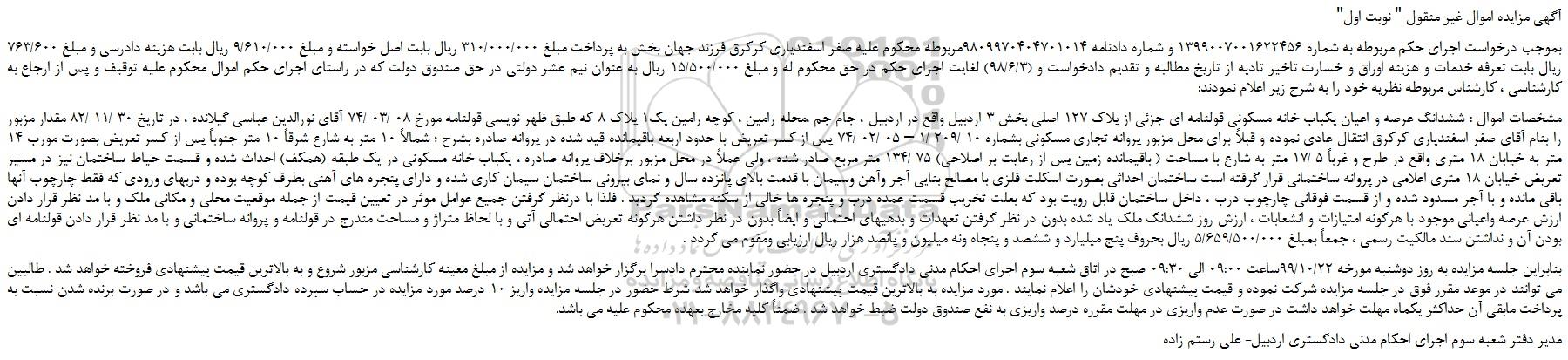 "آگهی مزایده اموال غیر منقول " نوبت اول