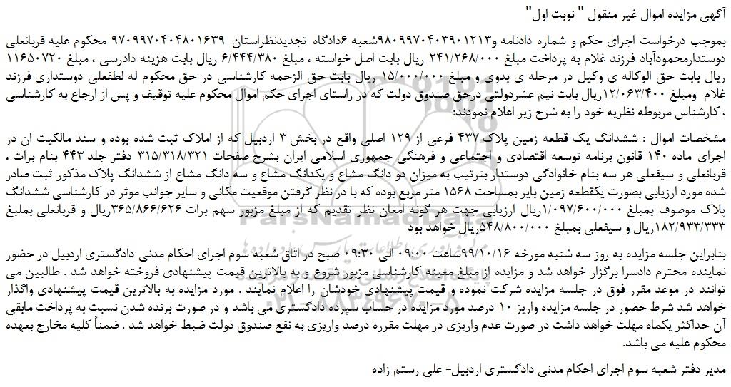 مشخصات اموال : ششدانگ یک قطعه زمین پلاک 437 فرعی از 129 اصلی واقع در بخش 3 اردبیل که از املاک ثبت شده بوده و سند مالکیت ان در اجرای ماده 140 قانون برنامه توسعه اقتصادی و اجتماعی و فرهنگی جمهوری اسلامی ایران بشرح صفحات 315/318/321 دفتر جلد 443 بنام برات ، قربانعلی و سیفعلی هر سه بنام خانوادگی دوستدار بترتیب به میزان دو دانگ مشاع و یکدانگ مشاع و سه دانگ مشاع از ششدانگ پلاک مذکور ثبت صادر شده مورد ارزیابی بصورت یکقطعه زمین بایر بمساحت 1568 متر مربع بوده که با در نظر گرفتن موقعیت مکانی و سایر جوانب موثر در کارشناسی ششدانگ پلاک موصوف بمبلغ 1/097/600/000ریال ارزیابی جهت هر گونه امعان نظر تقدیم که از مبلغ مزبور سهم برات 365/866/626ریال و قربانعلی بملبغ 182/933/333ریال و سیفعلی بمبلغ 548/800/000ریال خواهد بود