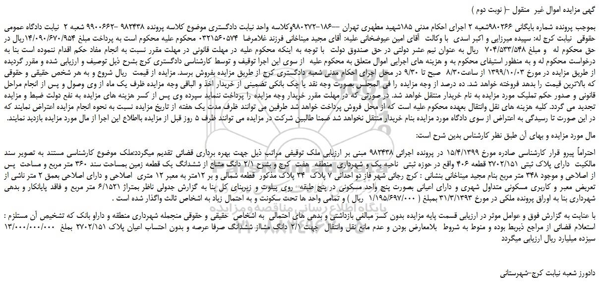 بموجب پرونده شماره بایگانی 980266شعبه 2 اجرای احکام مدنی 185شهید مطهری تهران --186-980272وکلاسه واحد نیابت دادگستری موضوع کلاسه پرونده 982438 -9900662 شعبه 2  نیابت دادگاه عمومی حقوقی  نیابت کرج له: سپیده میرزایی و اکبر اسدی  با وکالت  آقای امین عیوضخانی علیه: آقای مجید میناخانی فرزند غلامرضا  0321560574 محکوم علیه محکوم است به پرداخت مبلغ 14/090/670/954ریال در حق محکوم له  و مبلغ 704/533/548  ریال به عنوان نیم عشر دولتی در حق صندوق دولت  با توجه به اینکه محکوم علیه در مهلت قانونی در مهلت مقرر نسبت به انجام مفاد حکم اقدام ننموده است بنا به درخواست محکوم له و به منظور استیفای محکوم به و هزینه های اجرایی اموال متعلق به محکوم علیه  از سوی این اجرا توقیف و توسط کارشناسی دادگستری کرج بشرح ذیل توصیف و ارزیابی شده و مقرر گردیده از طریق مزایده در مورخ 1399/10/03 از ساعت8/30  صبح تا 9/30 در محل اجرای احکام مدنی شعبه دادگستری کرج از طریق مزایده بفروش برسد. مزایده از قیمت  ریال شروع و به هر شخص حقیقی و حقوقی که بالاترین قیمت را بدهد فروخته خواهد شد. ده درصد از وجه مزایده را فی المجلس بصورت وجه نقد یا چک بانکی تضمینی از خریدار اخذ و الباقی وجه مزایده ظرف یک ماه از وی وصول و پس از انجام مراحل قانونی و صدور حکم تملیک مورد مزایده به نام خریدار منتقل خواهد شد. در صورتی که در مهلت مقرر خریدار وجه مزایده را پرداخت ننماید سپرده وی پس از کسر هزینه های مزایده به نفع دولت ضبط و مزایده تجدید می گردد. کلیه هزینه های نقل وانتقال بعهده محکوم علیه است که از محل فروش پرداخت خواهد شد طرفین می توانند ظرف مدت یک هفته از تاریخ مزایده نسبت به نحوه انجام مزایده اعتراض نمایند که در این صورت تا رسیدگی به اعتراض از سوی دادگاه مورد مزایده بنام خریدار منتقل نخواهد شد ضمنا طالبین شرکت در مزایده می توانند ظرف 5 روز قبل از مزایده بااطلاع این اجرا از مال مورد مزایده بازدید نمایند.