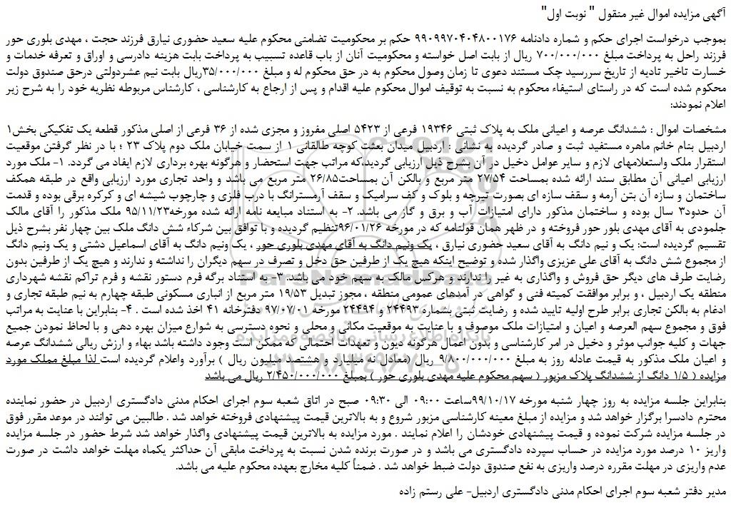 بنابراین جلسه مزایده به روز چهار شنبه مورخه 99/10/17ساعت 09:00 الی 09:30 صبح در اتاق شعبه سوم اجرای احکام مدنی دادگستری اردبیل در حضور نماینده محترم دادسرا برگزار خواهد شد و مزایده از مبلغ معینه کارشناسی مزبور شروع و به بالاترین قیمت پیشنهادی فروخته خواهد شد . طالبین می توانند در موعد مقرر فوق در جلسه مزایده شرکت نموده و قیمت پیشنهادی خودشان را اعلام نمایند . مورد مزایده به بالاترین قیمت پیشنهادی واگذار خواهد شد شرط حضور در جلسه مزایده واریز 10 درصد مورد مزایده در حساب سپرده دادگستری می باشد و در صورت برنده شدن نسبت به پرداخت مابقی آن حداکثر یکماه مهلت خواهد داشت در صورت عدم واریزی در مهلت مقرره درصد واریزی به نفع صندوق دولت ضبط خواهد شد . ضمناً کلیه مخارج بعهده محکوم علیه می باشد.