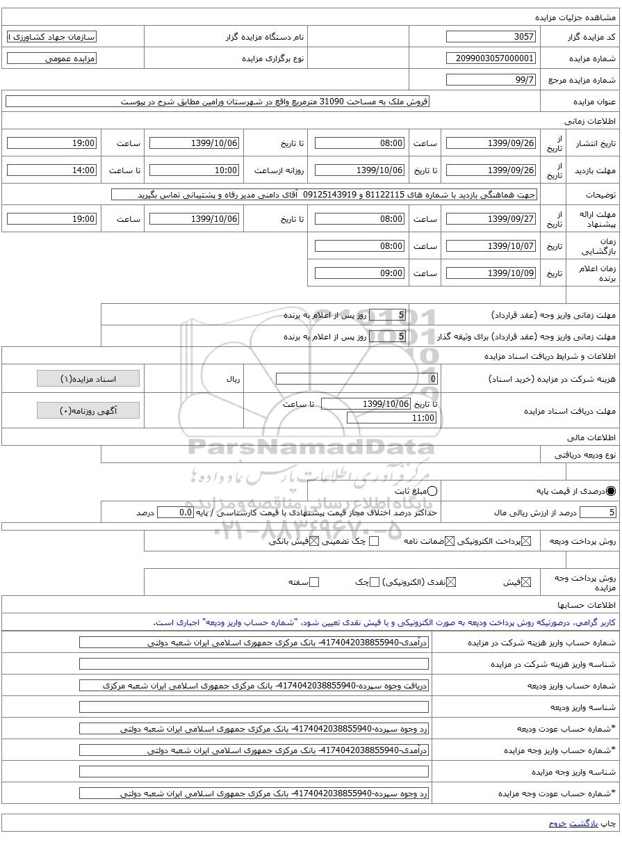 مزایده عمومی مزایده، فروش ملک به مساحت 31090 مترمربع واقع در شهرستان ورامین مطابق شرح در پیوست برگزار میگردد. از کلیه افراد متخصص و شرکت‌های واجد شرایط دعوت به عمل می‌آید تا در این مزایده با کد خبرگزاری پارس نماد : 2975043 شرکت نمایند تاریخ شروع مزایده : 1399/09/26 مهلت شرکت در مزایده: تا پایان روز 1399/10/06 مکان برگزاری اموال واگذاری استان‌های مزایدات استان تهران و دسته‌بندی‌های مربوط به این حراجی املاک و زمین میباشد.