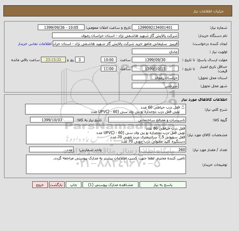 نام دستگاه خریدار:شرکت پالایش گاز شهید هاشمی نژاد - استان خراسان رضوی