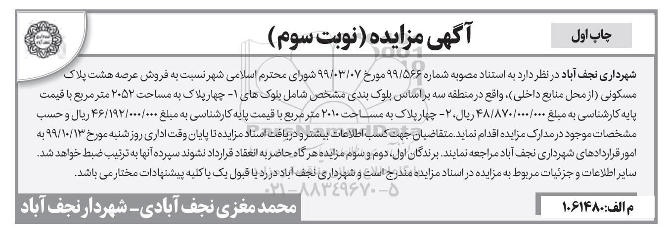 مزایده فروش عرصه هشت پلاک مسکونی نوبت سوم چاپ اول