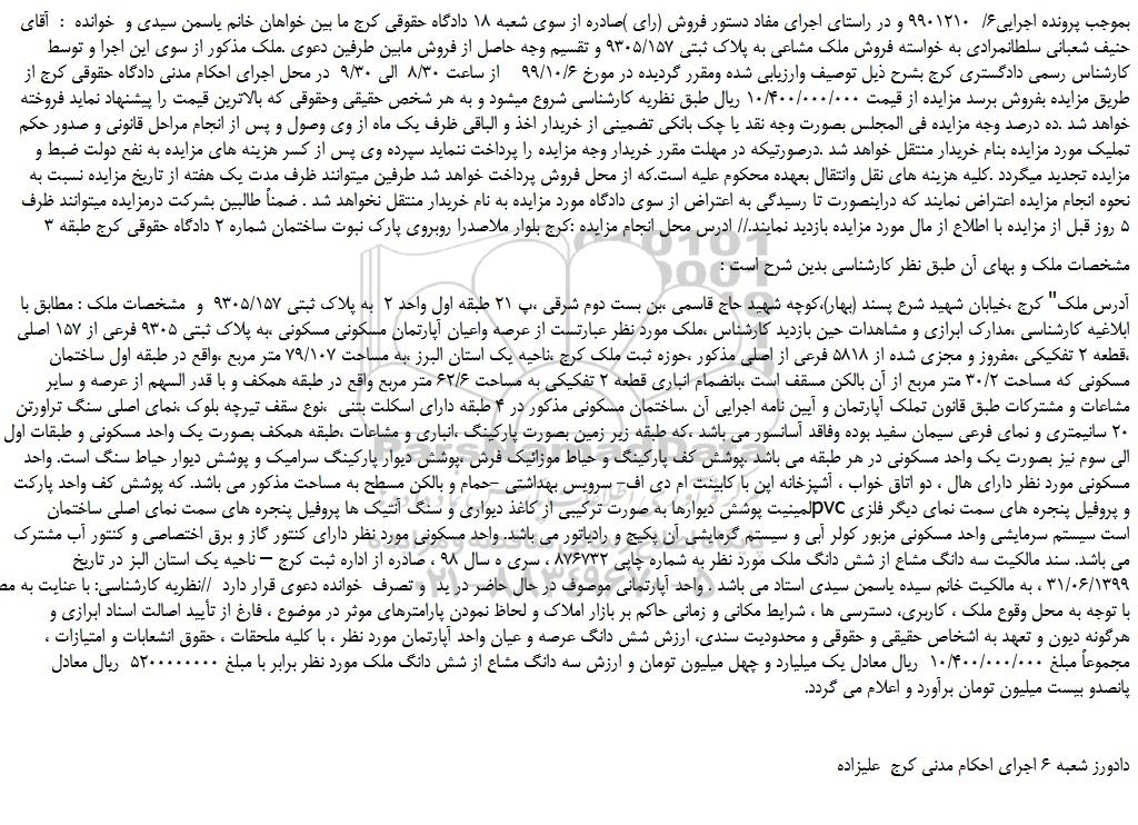 بموجب پرونده اجرایی6/ 9901210 و در راستای اجرای مفاد دستور فروش (رای )صادره از سوی شعبه 18 دادگاه حقوقی کرج ما بین خواهان خانم یاسمن سیدی و خوانده : آقای حنیف شعبانی سلطانمرادی به خواسته فروش ملک مشاعی به پلاک ثبتی 9305/157 و تقسیم وجه حاصل از فروش مابین طرفین دعوی .ملک مذکور از سوی این اجرا و توسط کارشناس رسمی دادگستری کرج بشرح ذیل توصیف وارزیابی شده ومقرر گردیده در مورخ 99/10/6 از ساعت 8/30 الی 9/30 در محل اجرای احکام مدنی دادگاه حقوقی کرج از طریق مزایده بفروش برسد مزایده از قیمت 10/400/000/000 ریال طبق نظریه کارشناسی شروع میشود و به هر شخص حقیقی وحقوقی که بالاترین قیمت را پیشنهاد نماید فروخته خواهد شد .ده درصد وجه مزایده فی المجلس بصورت وجه نقد یا چک بانکی تضمینی از خریدار اخذ و الباقی ظرف یک ماه از وی وصول و پس از انجام مراحل قانونی و صدور حکم تملیک مورد مزایده بنام خریدار منتقل خواهد شد .درصورتیکه در مهلت مقرر خریدار وجه مزایده را پرداخت ننماید سپرده وی پس از کسر هزینه های مزایده به نفع دولت ضبط و مزایده تجدید میگردد .کلیه هزینه های نقل وانتقال بعهده محکوم علیه است.که از محل فروش پرداخت خواهد شد طرفین میتوانند ظرف مدت یک هفته از تاریخ مزایده نسبت به نحوه انجام مزایده اعتراض نمایند که دراینصورت تا رسیدگی به اعتراض از سوی دادگاه مورد مزایده به نام خریدار منتقل نخواهد شد . ضمناً طالبین بشرکت درمزایده میتوانند ظرف 5 روز قبل از مزایده با اطلاع از مال مورد مزایده بازدید نمایند.// ادرس محل انجام مزایده :کرج بلوار ملاصدرا روبروی پارک نبوت ساختمان شماره 2 دادگاه حقوقی کرج طبقه 3