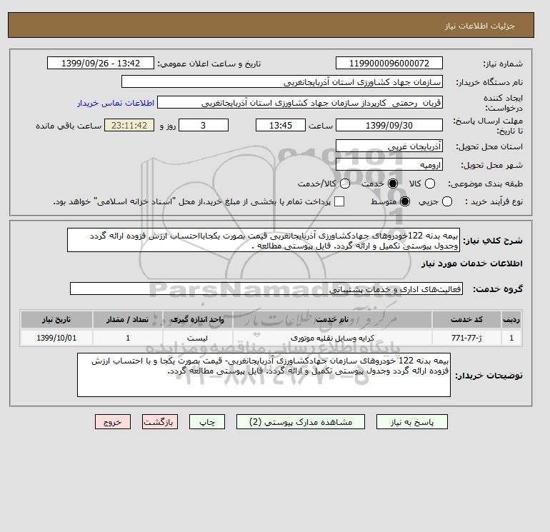 شرح کلی نیاز: بیمه بدنه 122خودروهای جهادکشاورزی آذربایجانغربی قیمت بصورت یکجابااحتساب ارزش فزوده ارائه گردد وجدول پیوستی تکمیل و ارائه گردد. فایل پیوستی مطالعه .