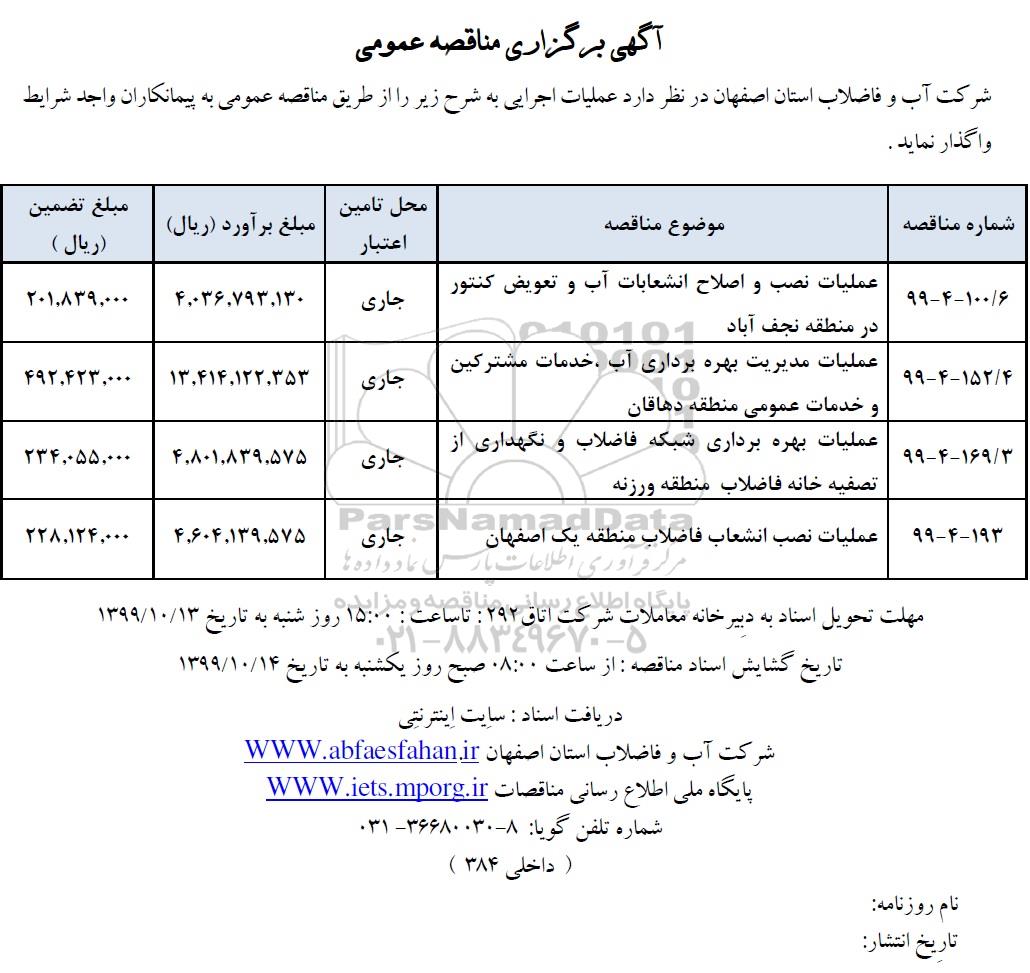 شرکت آب و فاضلاب استان اصفهان در نظر دارد عملیات اجرایی به شرح زیر را از طریق مناقصه عمومی به پیمانکاران واجد شرایط واگذار نماید