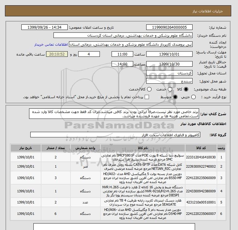 استعلام بها و موضوع استعلام استعلام برند خاصی مورد نظر نیست.صرفاً ایرانی بودن برند کافی میباشد.ایران کد فقط جهت مشخصات کالا وارد شده است.تمامی هزینه ها بر عهده فروشنده میباشد. به اطلاع کلیه شرکتها و افراد متخصص واجد شرایط میرساند، آگهی گذار در نظر دارد از طریق استعلام بها، نسبت به انتخاب و دریافت پیشنهادات اقدام نماید. این استعلام با کد آگهی ثبت شده در سامانه خبرگزاری پارس نماد : 2977700 منتشر شده است. مشخصات استعلام : تاریخ شروع استعلام: 1399/09/26 آخرین مهلت ارسال پیشنهاد قیمت : 1399/09/30 و محل اجرای پروژه : استان کردستان میباشد. استعلام قیمت مورد درخواست : استعلام برند خاصی مورد نظر نیست.صرفاً ایرانی بودن برند کافی میباشد.ایران کد فقط جهت مشخصات کالا وارد شده است.تمامی هزینه ها بر عهده فروشنده میباشد. با دستهبندیهای تخصصی و گروه های مرتبط : سیستم های حفاظتی-دوربین مدار بسته،دزدگیر،آیفون تصویری و آنتن مرکزی, صوت و تصویر - وسایل عکاسی و دیتا پرژکتور, کامپیوتر, استعلام اطلاع رسانی میگردد.