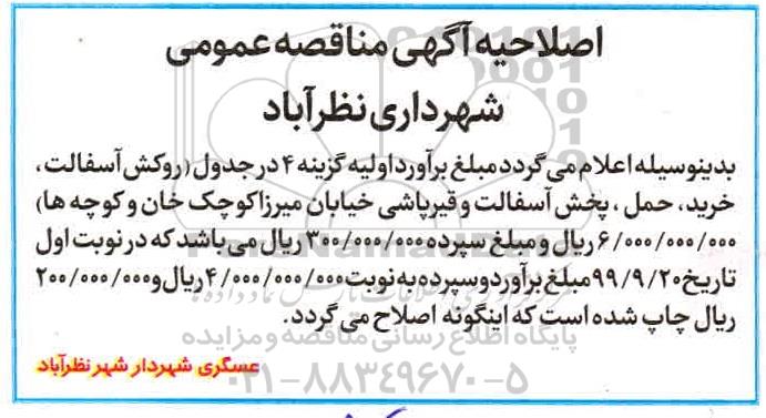 اصلاحیه مناقصه آسفالت خرید، حمل، پخش آسفالت و قیرپاشی, اصلاحیه مناقصه آسفالت خرید، حمل، پخش آسفالت و قیرپاشی