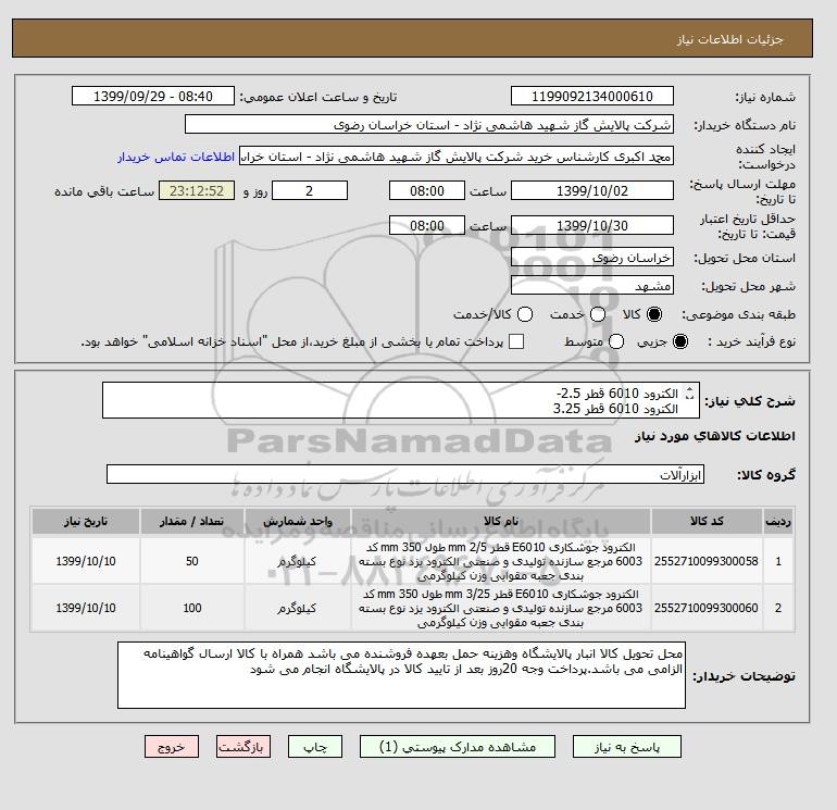 شرح کلی نیاز: الکترود 6010 قطر 2.5-