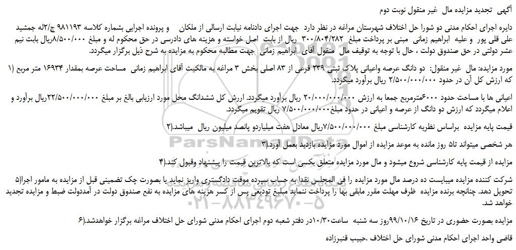 دایره اجرای احکام مدنی دو شورا حل اختلاف شهرستان مراغه در نظر دارد  جهت اجرای دادنامه نیابت ارسالی از ملکان    و پرونده اجرایی بشماره کلاسه 981193 ج/2له جمشید علی قلی پور  و علیه  ابراهیم زمانی  مبنی بر پرداخت مبلغ  300/804/282  ریال از بابت  اصل خواسته و هزینه های دادرسی در حق محکوم له و مبلغ 8/500/000ریال بابت نیم عشر دولتی در حق صندوق دولت ، حال با توجه به توقیف مال  منقول آقای  ابراهیم زمانی  جهت مطالبه محکوم به مزایده به شرح ذیل برگزار میگردد.