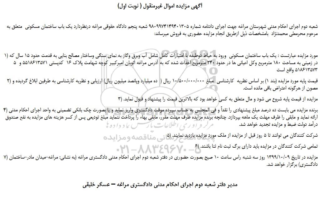 شعبه دوم اجرای احکام مدنی شهرستان مراغه جهت اجرای دادنامه شماره 9809974149401305 شعبه پنجم دادگاه حقوقی مراغه درنظردارد یک باب ساختمان مسکونی متعلق به مرحوم محرمعلی محمدنژاد بامشخصات ذیل ازطریق انجام مزایده حضوری به فروش میرساند: