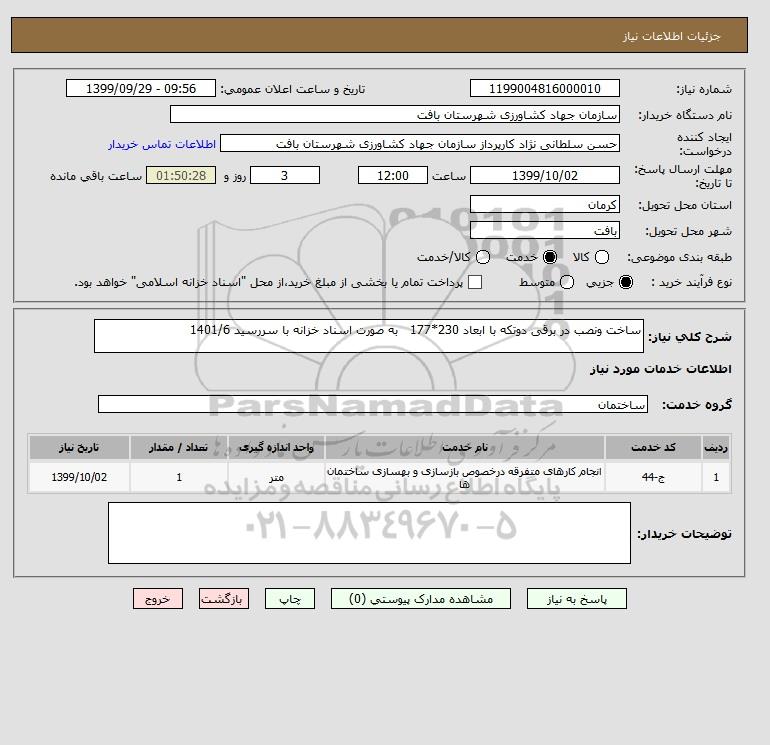 شرح کلی نیاز: ساخت ونصب در برقی دوتکه با ابعاد 230*177 به صورت اسناد خزانه با سررسید 1401/6