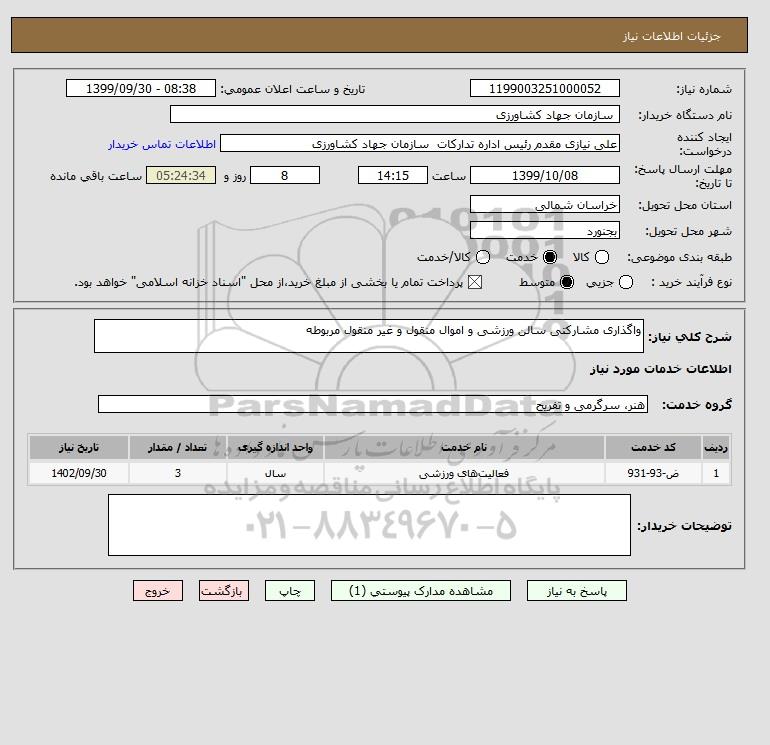 مزایده عمومی استعلام واگذاری مشارکتی سالن ورزشی و اموال منقول و غیر منقول مربوطه برگزار میگردد. از کلیه افراد متخصص و شرکتهای واجد شرایط دعوت به عمل میآید تا در این مزایده با کد خبرگزاری پارس نماد : 2984600 شرکت نمایند تاریخ شروع مزایده : 1399/09/30 مهلت شرکت در مزایده: تا پایان روز 1399/10/08 مکان برگزاری اموال واگذاری استانهای مزایدات استان خراسان شمالی و دستهبندیهای مربوط به این حراجی واگذاری ورزشگاه، پارکینگ، غرفه و بوفه, متفرقه میباشد.