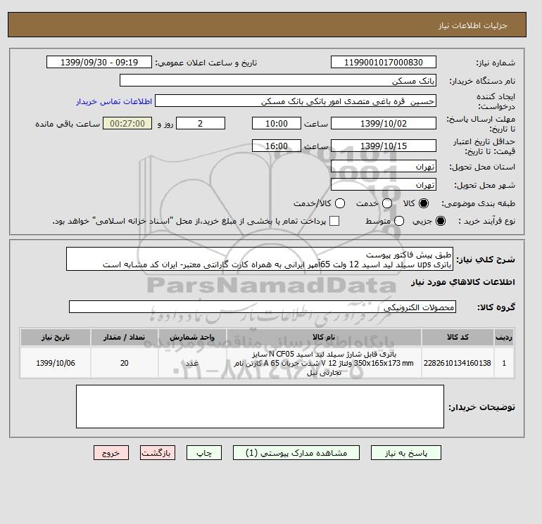 استعلام بها و موضوع استعلام استعلام طبق پیش فاکتور پیوست باتری ups سیلد لید اسید 12 ولت 65آمپر ایرانی به همراه کارت گارانتی معتبر- ایران کد مشابه است به اطلاع کلیه شرکتها و افراد متخصص واجد شرایط میرساند، آگهی گذار در نظر دارد از طریق استعلام بها، نسبت به انتخاب و دریافت پیشنهادات اقدام نماید. این استعلام با کد آگهی ثبت شده در سامانه خبرگزاری پارس نماد : 2984848 منتشر شده است. مشخصات استعلام : تاریخ شروع استعلام: 1399/09/30 آخرین مهلت ارسال پیشنهاد قیمت : 1399/10/02 و محل اجرای پروژه : استان تهران میباشد. استعلام قیمت مورد درخواست : استعلام طبق پیش فاکتور پیوست باتری ups سیلد لید اسید 12 ولت 65آمپر ایرانی به همراه کارت گارانتی معتبر- ایران کد مشابه است با دستهبندیهای تخصصی و گروه های مرتبط : منابع تغذیه, تجهیزات برق و الکترونیک, استعلام اطلاع رسانی میگردد. شرایط شرکت در استعلام آنلاین : ابتدا ثبت نام در سامانه استعلام پارس نماد و تکمیل مدارک موردنیاز و بارگذاری در سامانه رعایت تمامی ضوابط و الزامات مندرج در اسناد استعلام است.