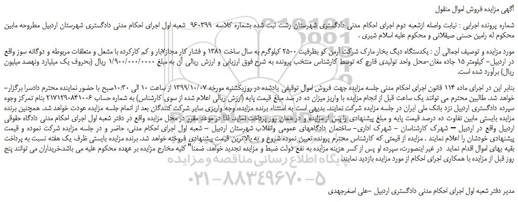 مورد مزایده و توصیف اجمالی آن : یکدستگاه دیگ بخار مارک شرکت آرمن کو بظرفیت 2500 کیلوگرم به سال ساخت 1381 و فشار کار مجاز7بار و کم کارکرده با مشعل و متعلقات مربوطه و دوگانه سوز واقع در اردبیل- کیلومتر 15 جاده مغان-محل واحد تولیدی قارچ که توسط کارشناس منتخب پرونده به شرح فوق ارزیابی و ارزش ریالی آن به مبلغ 1/900/000/0000 ریال (بحروف یک میلیارد ونهصد میلیون ریال) برآورد شده است.