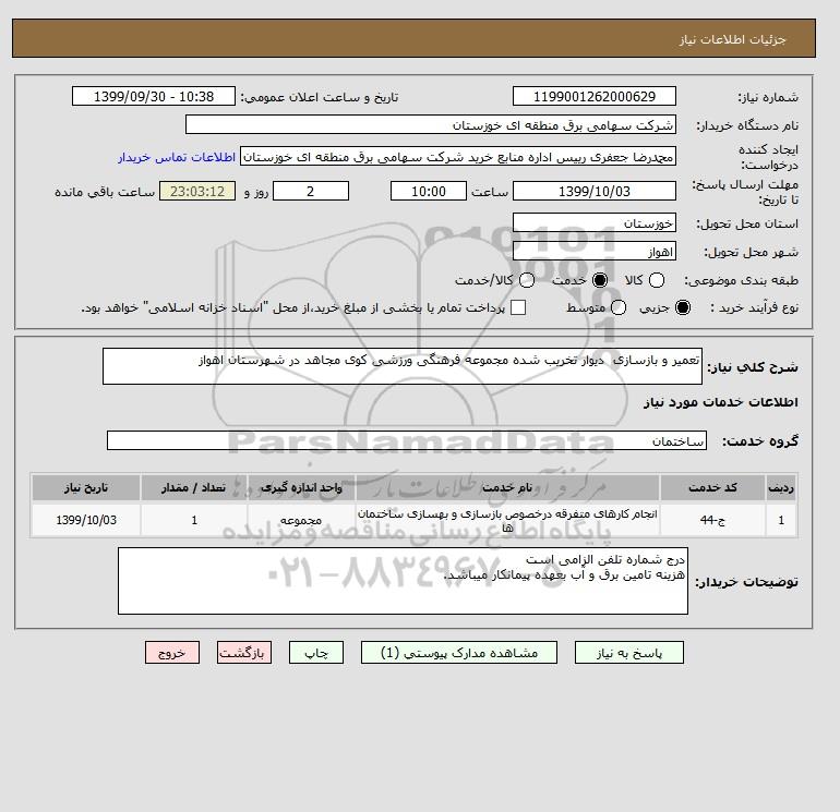 شرح کلی نیاز: تعمیر و بازسازی دیوار تخریب شده مجموعه فرهنگی ورزشی کوی مجاهد در شهرستان اهواز