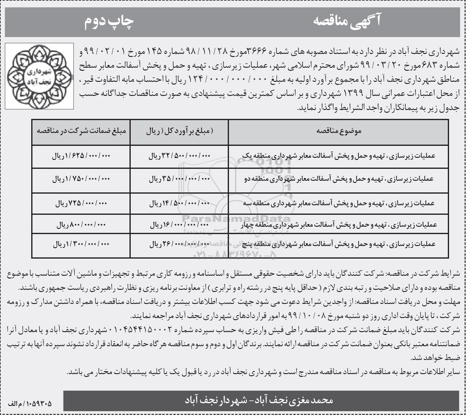شهرداری نجف آباد در نظر دارد به استناد مصوبه شورای محترم اسلامی شهر عملیات زیرسازی ، تهیه و حمل و پخش آسفالت جهت معابر سطح مناطق شهرداری نجف آباد را با مجموع براورد اولیه به مبلغ 124.000.000.000 ریال با احتساب مابه التفاوت قیر از محل اعتبارات عمرانی سال 99 شهرداری و براساس کمترین قیمت پیشنهادی به صورت مناقصات جداگانه حسب جدول زیر به پیمانکاران واجد شرایط واگذار نماید.