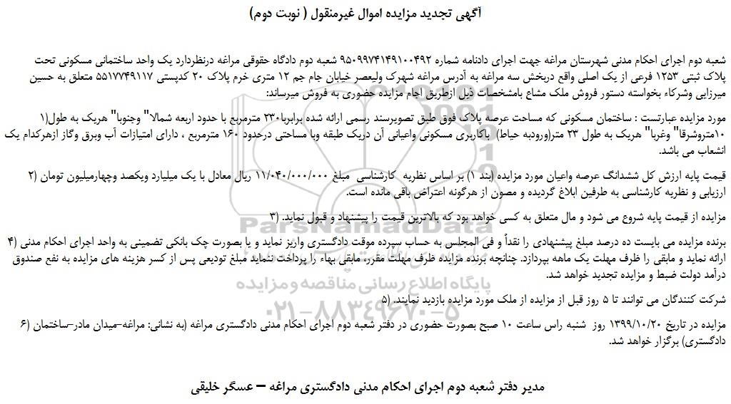 شعبه دوم اجرای احکام مدنی شهرستان مراغه جهت اجرای دادنامه شماره 9509974149100492 شعبه دوم دادگاه حقوقی مراغه درنظردارد یک واحد ساختمانی مسکونی تحت پلاک ثبتی 1253 فرعی از یک اصلی واقع دربخش سه مراغه به آدرس مراغه شهرک ولیعصر خیابان جام جم 12 متری خرم پلاک 20 کدپستی 5517749117 متعلق به حسین میرزایی وشرکاء بخواسته دستور فروش ملک مشاع بامشخصات ذیل ازطریق اجام مزایده حضوری به فروش میرساند:
