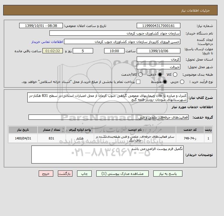 شرح کلی نیاز: کنترل و مبارزه با آفات وبیماریهای عمومی گیاهی جنوب کرمان از محل اعتبارات استانی-در سطح 831 هکتار-در شهرستانهای منوجان -رودبار-قلعه گنج