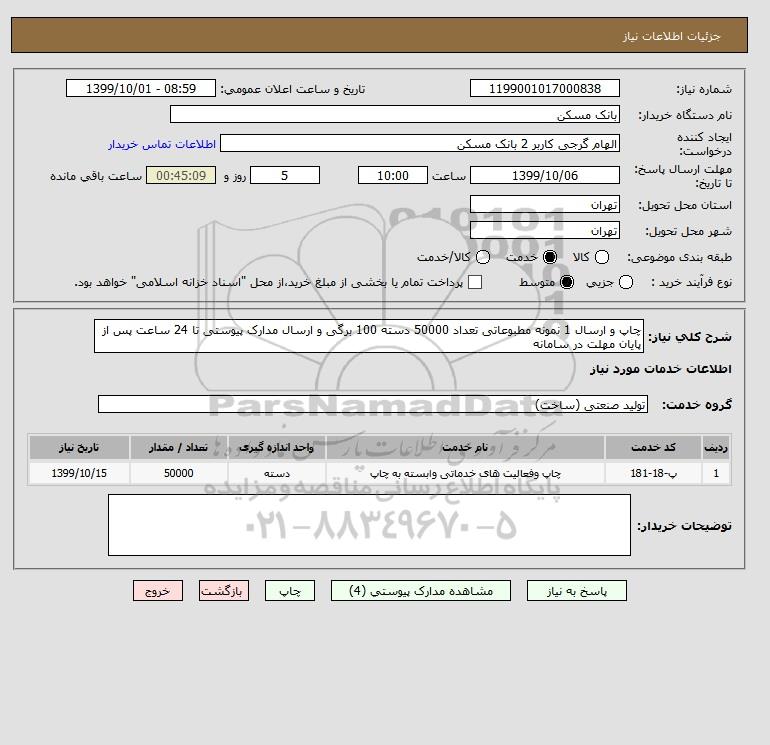 شرح کلی نیاز: چاپ و ارسال 1 نمونه مطبوعاتی تعداد 50000 دسته 100 برگی و ارسال مدارک پیوستی تا 24 ساعت پس از پایان مهلت در سامانه