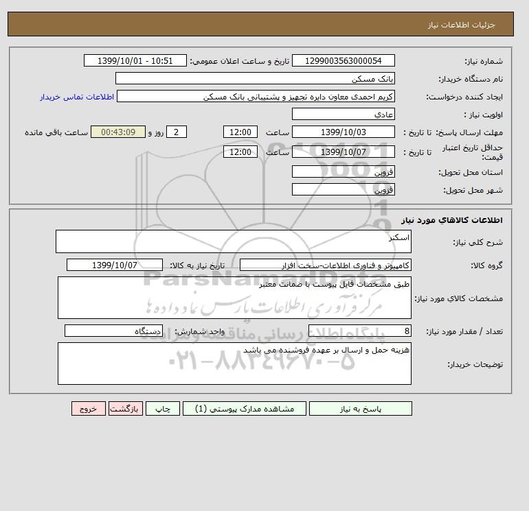 استعلام بها و موضوع استعلام استعلام اسکنر به اطلاع کلیه شرکتها و افراد متخصص واجد شرایط میرساند، آگهی گذار در نظر دارد از طریق استعلام بها، نسبت به انتخاب و دریافت پیشنهادات اقدام نماید. این استعلام با کد آگهی ثبت شده در سامانه خبرگزاری پارس نماد : 2990415 منتشر شده است. مشخصات استعلام : تاریخ شروع استعلام: 1399/10/01 آخرین مهلت ارسال پیشنهاد قیمت : 1399/10/03 و محل اجرای پروژه : استان قزوین میباشد. استعلام قیمت مورد درخواست : استعلام اسکنر با دستهبندیهای تخصصی و گروه های مرتبط : کامپیوتر, ماشین اداری, استعلام اطلاع رسانی میگردد. شرایط شرکت در استعلام آنلاین : ابتدا ثبت نام در سامانه استعلام پارس نماد و تکمیل مدارک موردنیاز و بارگذاری در سامانه رعایت تمامی ضوابط و الزامات مندرج در اسناد استعلام است.