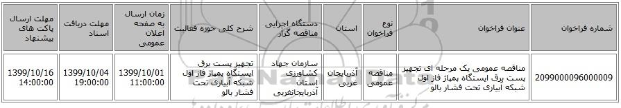 | 2099000096000009 | مناقصه عمومی یک مرحله ای تجهیز پست برق ایستگاه پمپاژ فاز اول شبکه آبیاری تحت فشار بالو | مناقصه عمومی | آذربایجان غربی | سازمان جهاد کشاورزی استان آذربایجانغربی | تجهیز پست برق ایستگاه پمپاژ فاز اول شبکه آبیاری تحت فشار بالو | 1399/10/01 11:00:00 | 1399/10/04 19:00:00 | 1399/10/16 14:00:00 |